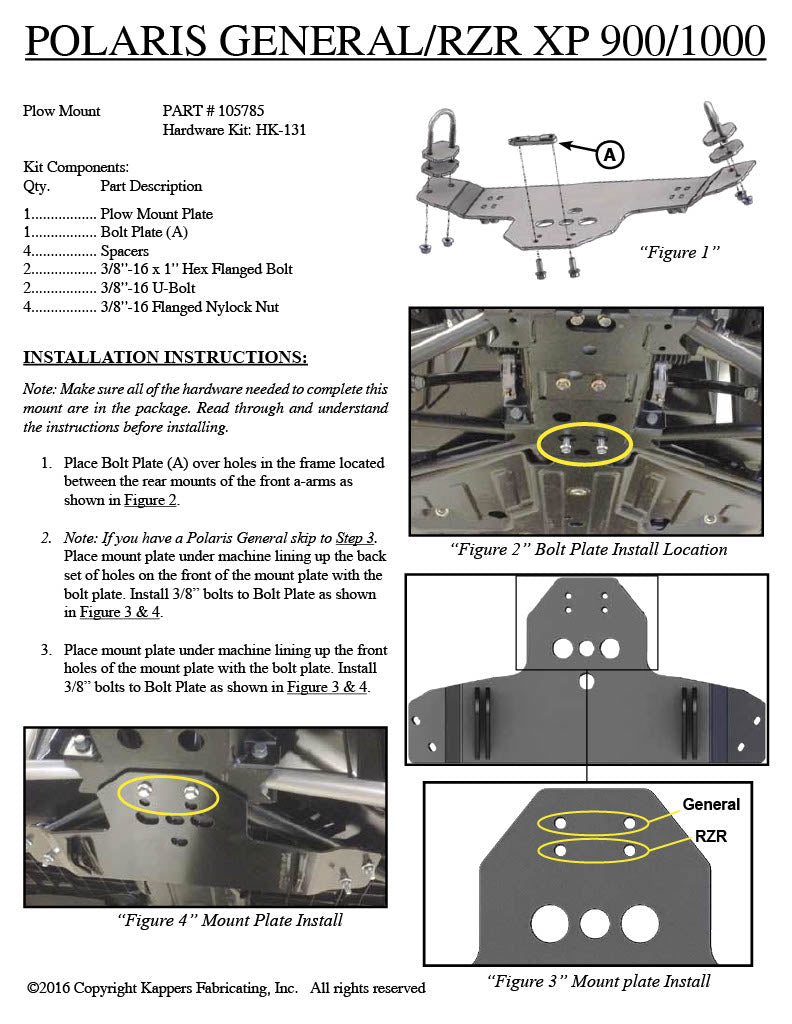 2014 POLARIS 900 RZR 4 (EPS)/2012-2013 900 RZR XP 4 (Base/EPS) / 2011 2012 2013 900 XP (Base/EPS/Jagged X) – KFI Snow Plow Mid-Mount 105785
